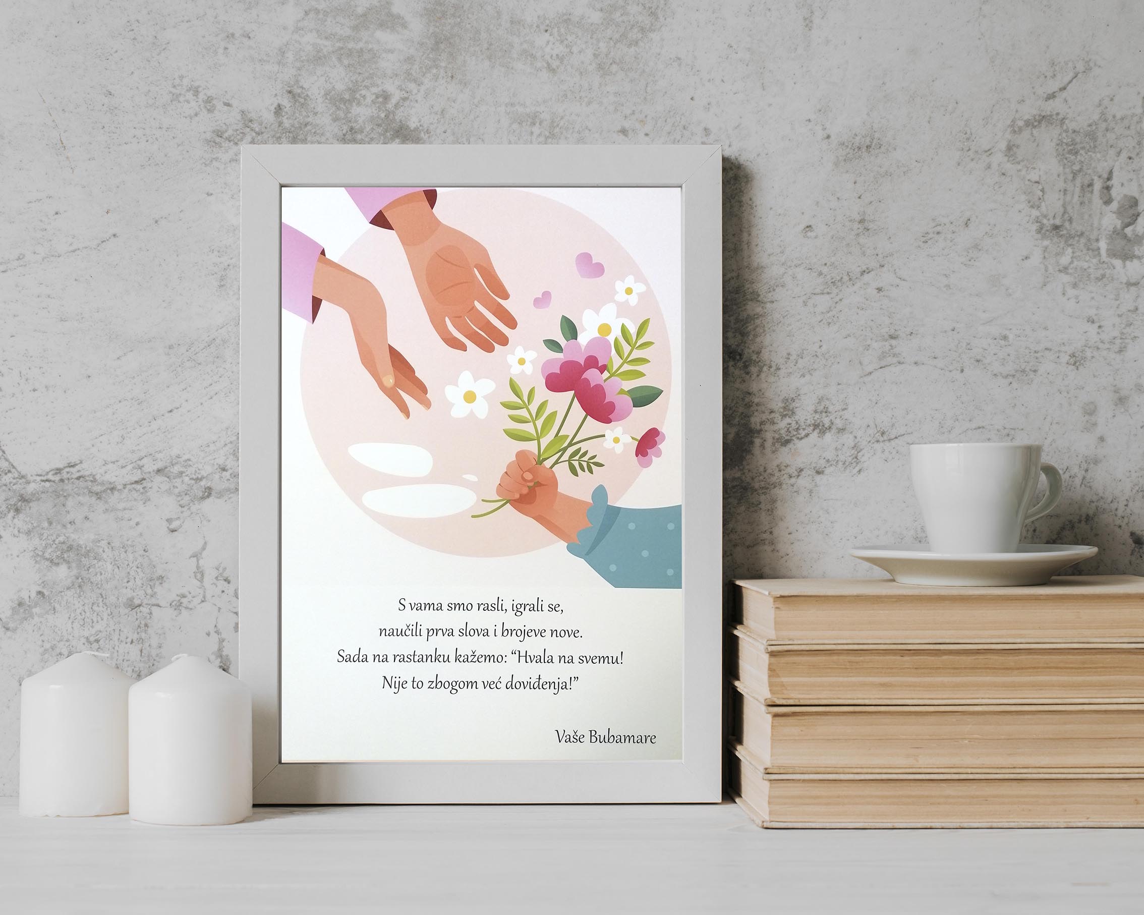 “S Vama smo rasli, igrali se, naučili prva slova i brojeve nove. Sada na rastanku kažemo: “Hvala na svemu! Nije to zbogom, već doviđenja!” poruka je na šestoj verziji zidne posvete namijenjene za učitelj(ic)e/tete u vrtiću. Što pokloniti učitelj(ici)u ili odgojiteljici u vrtiću na dan rastanka? Ako razmišljate o zidnim posvetama za učitelj(ic)e i odgojiteljice u vrtiću, onda ste na pravom mjestu. Nudimo vam personalizirane zidne posvete s porukom po Vašoj želji, te imenom i prezimenom učiteljice/odgojiteljice, kojoj je poklon namijenjen. Na njih ćemo upisati i razred/grupu vašeg djeteta. Zidne posvete dolaze u veličini 26×35 cm te u veličini A4 (21×30 cm).